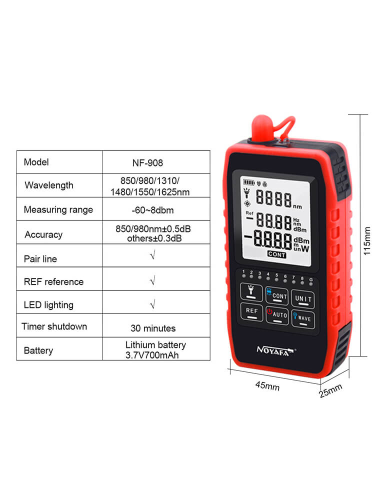 - Optical Power Measurement - Can measure single-mode wavelengths like 1310, 1490, 1550, and 1625nm with measurement range from -60 to +8dBm.