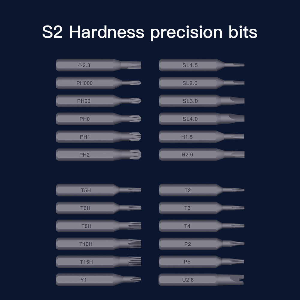 - 24 Strong Magnetic Bits - There are 24 different types of magnetic bits available, including the Phillips bit, Slotted bit, Internal Hex bit, Torx bit, 5 point star bit, Tri-Wing bit, Square bit, etc., to suit different screws and applications. These screwdriver bits are made of S2 alloy steel which is shock-resisting and wear-resisting for long service life.
